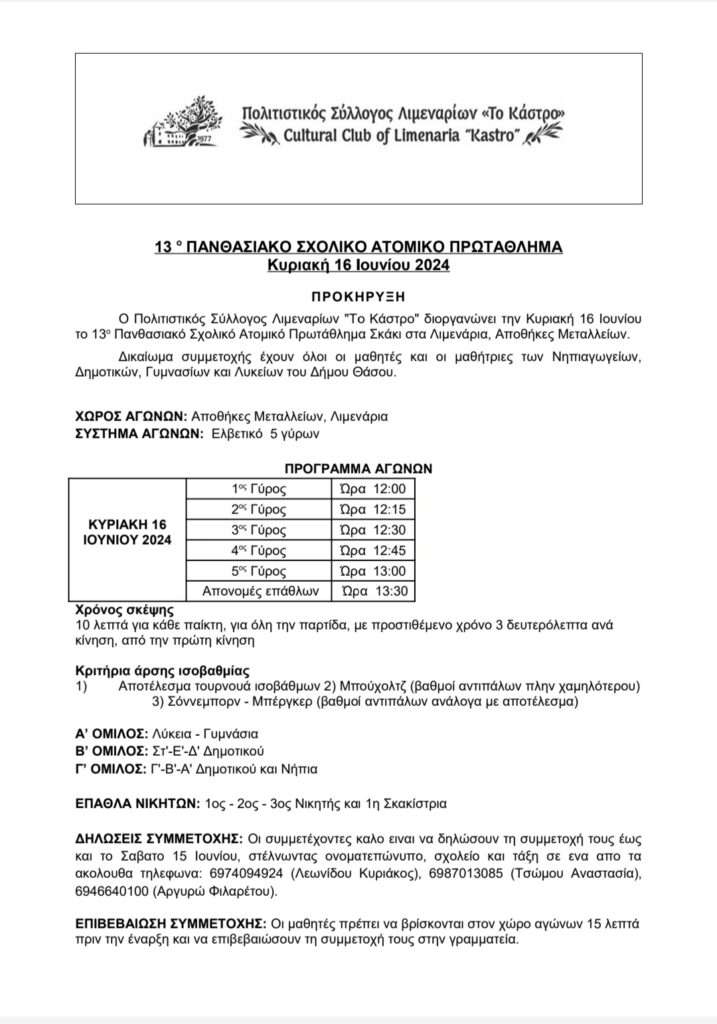 Ο Πολιτιστικός Σύλλογος Λιμεναρίων “Το Κάστρο” διοργανώνει την Κυριακή 16 Ιουνίου 2024 το 13ο Πανθασιακό Σχολικό Ατομικό Πρωτάθλημα Σκακιού στα Λιμενάρια, Αποθήκες Μεταλλείων.